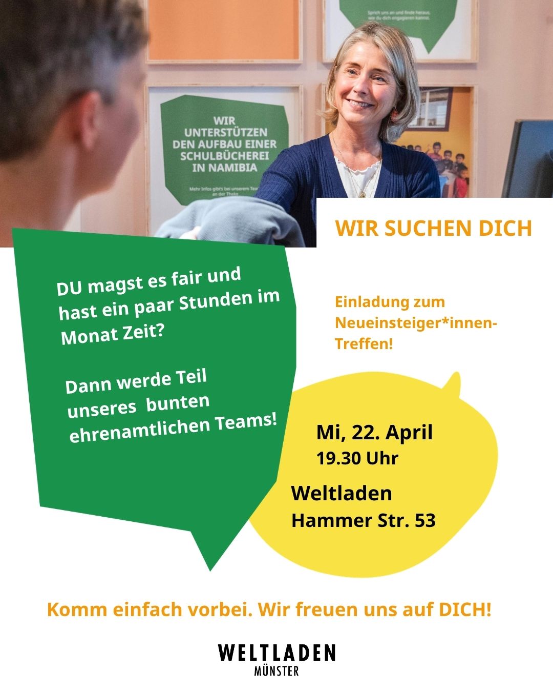 Anmelden brauchst du dich nicht, schau einfach vorbei. Falls dir der Termin nicht passt, du aber Lust hast uns kennen zu lernen, dann schreibe einfach eine Mail an info@weltladenmuenster.de oder ruf kurz durch: 0251-45002