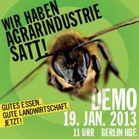 "Wir haben es satt!" - unter diesem Motto findet am 19. Januar 2013 wieder Deutschlands größte Demo gegen Tierfabriken und andere Auswüchse der Agrarindustrie statt. Die Bundesregierung hat im Rahmen der Grünen Woche, die vom 18. - 27. Januar in Berlin stattfindet, erneut zum Internationalen Agrarministergipfel in die Hauptstadt geladen. Dabei treffen sich Agrarminister aus aller Welt, um über Landwirtschaft und Industralisierung zu diskutieren. Bereits in den letzten beiden Jahren demonstrierten jeweils mehr als 20.000 Menschen für eine bäuerliche ökologische Landwirtschaft. Auch in diesem Jahr ziehen wieder Verbraucher, Umwelt- und Tierschützer, Imker und Bauern sowie entwicklungspolitische Gruppen zum Kanzleramt und verlangen von Bundeskanzlerin Merkel eine Neuausrichtung der Landschaftspolitik. Zu den Protesten ruft ein Trägerkreis aus verschiedenen Organisationen wie BUND, Misereor, Demeter, NABU, Bioland und vielen weiteren auf. Hier ist jeder herzlich eingeladen mitzumachen!