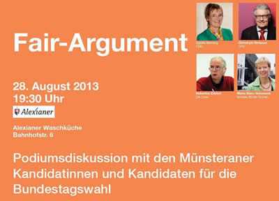 Im September steht die Bundestagswahl an. Ein Grund für uns mal genauer nachzuhaken bei den Münsteraner Kandidatinnen und Kandidaten für die Bundestagswahl. Gemeinsam mit Vamos e.V, la tienda e.V, dem Weltladen Solidario und der Christliche Initiative Romero veranstalten wir am 28. August um 19.30 Uhr in der Alexianer Waschküche eine interessante Podiumsdiskussion unter dem Titel "Fair-Argument". Fünf KandidatenInnen von SPD, CDU, FDP, DIE LINKE und DIE GRÜNEN diskutieren über folgende Themen: