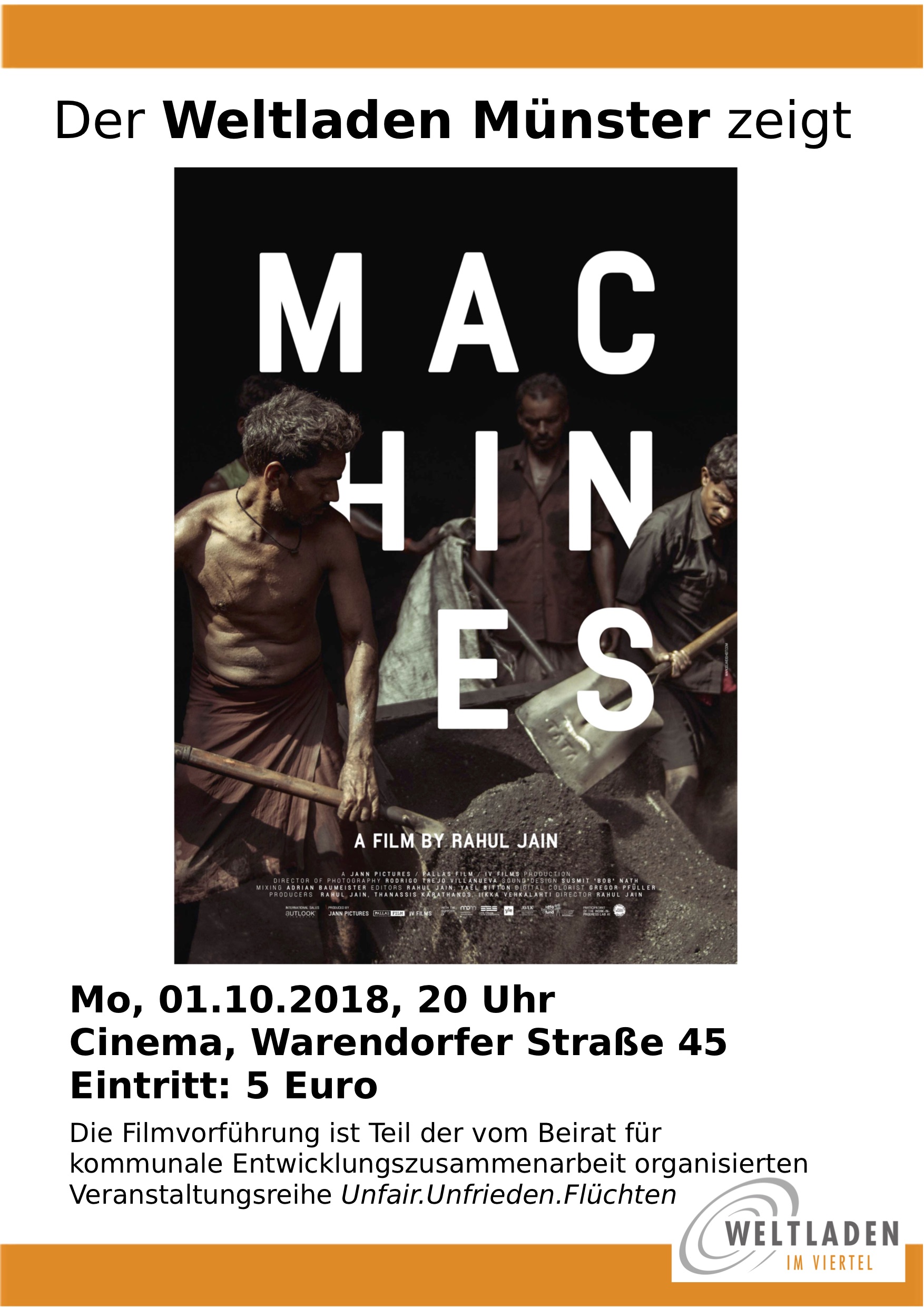 Bei uns ist viel los derzeit! :-) Nach der Veranstaltung ist vor der Veranstaltung. Dieses mal laden wir ins Kino ein! "Machines" - Die Maschine im Kontext der Textilindustrie heißt der Film, den wir am 01. Oktober 2018 um 20.00 Uhr im Rahmen der Veranstaltungsreihe "Unfair. Unfrieden. Flüchten." zeigen.