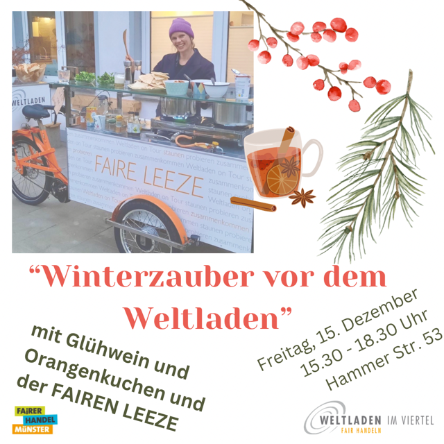 Macht am kommenden Freitag halt an unserem Weltladen an der Hammer Straße und besucht unsere FAIRE LEEZE und uns. Wir zaubern für euch leckeren, fairen Bio-Glühwein, selbstgemachten alkoholfreien Apfel-Punsch und backen dazu fruchtigen Orangenkuchen - passend zu unserer zweiten Orangenlieferung aus Süditalien, die wir kommenden Woche erwarten. Denn wir sind im Orangenfieber und möchten das gerne mit euch teilen. ;-)