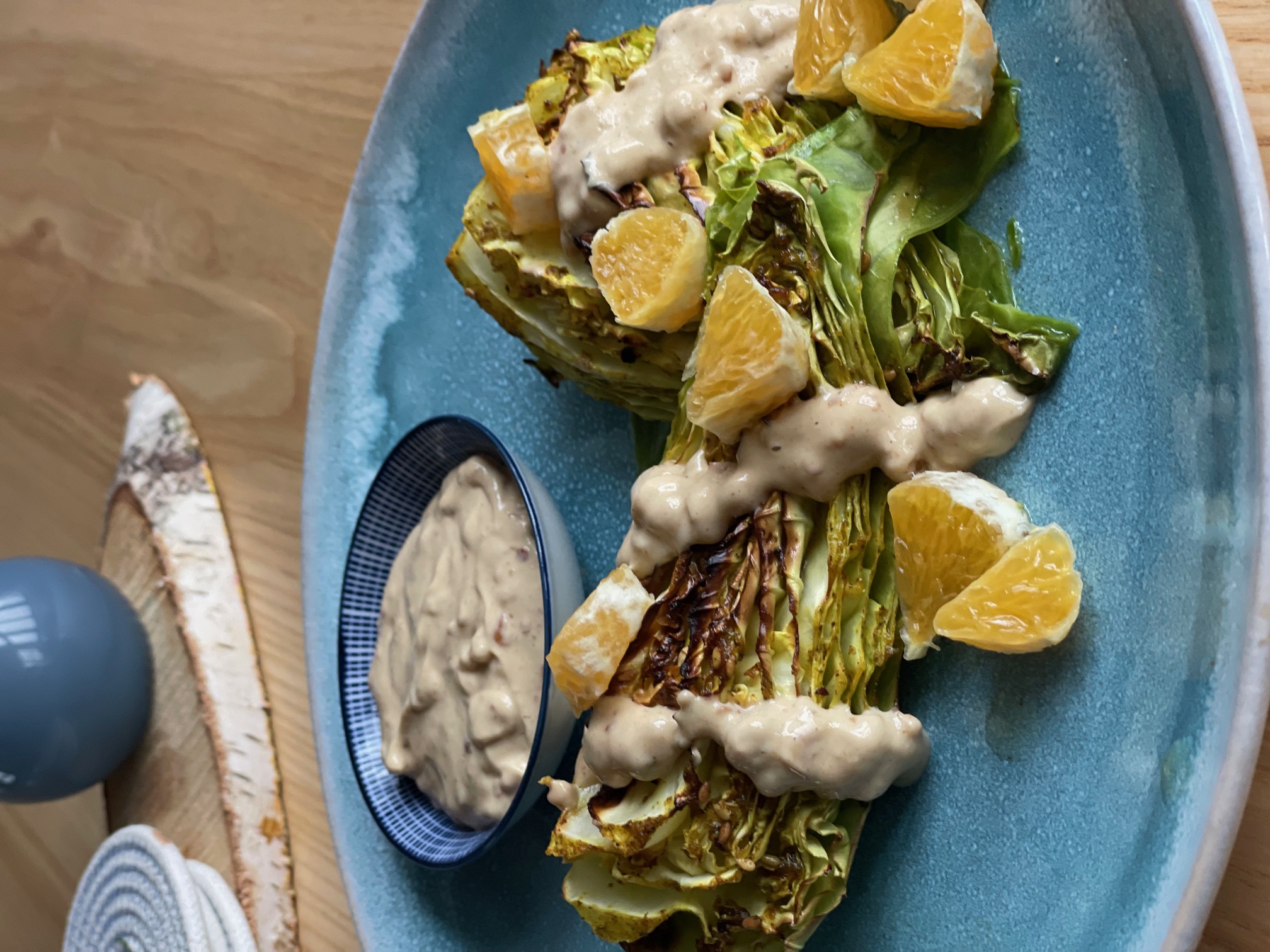 1 kleinen Spitzkohl, 1 TL Curry*, 4 EL Olivenöl*, 1/2 TL Paprikapulver*, 1 TL Zaatar*, Abrieb einer 1/4 Zitrone, Spritzer Agavandicksaft*, Salz* und Pfeffer*,1 Orange*